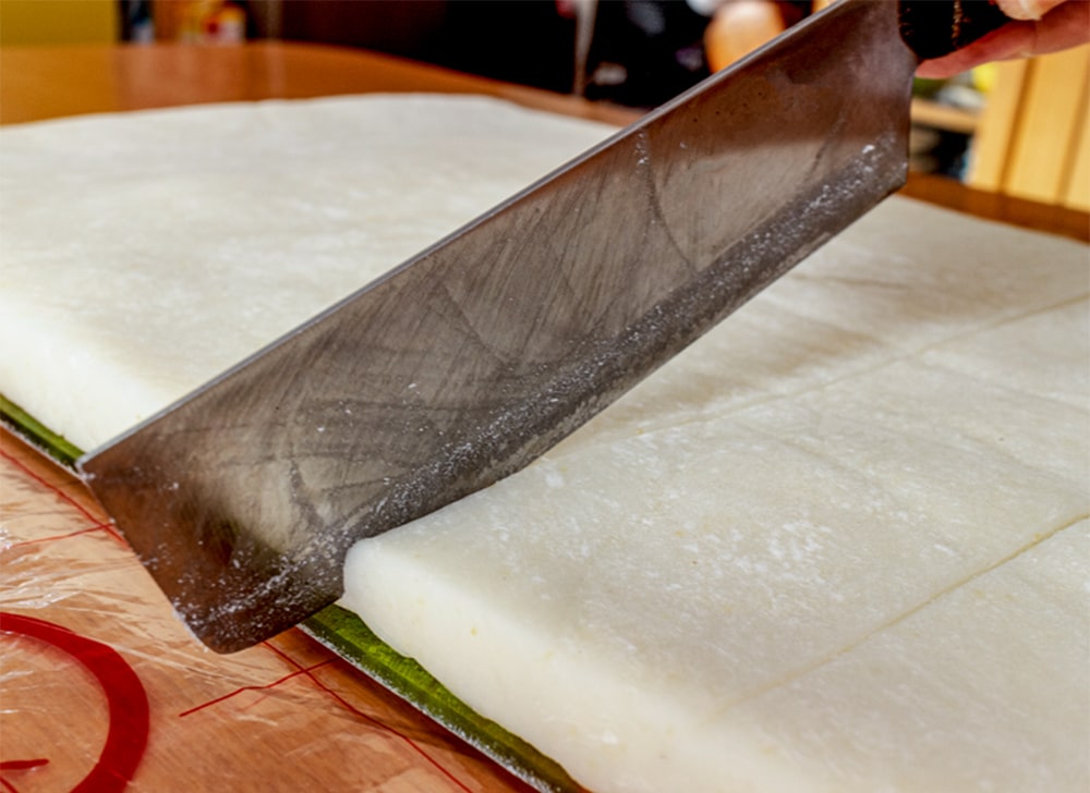 やや多めの1升もちです。平らにのして切れ目が入っているので、固くなったあと手で簡単に折れます。